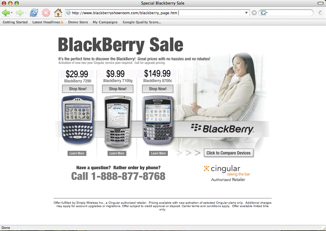 An offer-based landing page is one you use for visitors with the highest of intentions. If I’m searching for a new BlackBerry 8700c, and I type that phrase in a search engine, for example, I probably have my credit card ready to go.