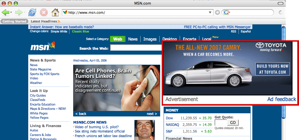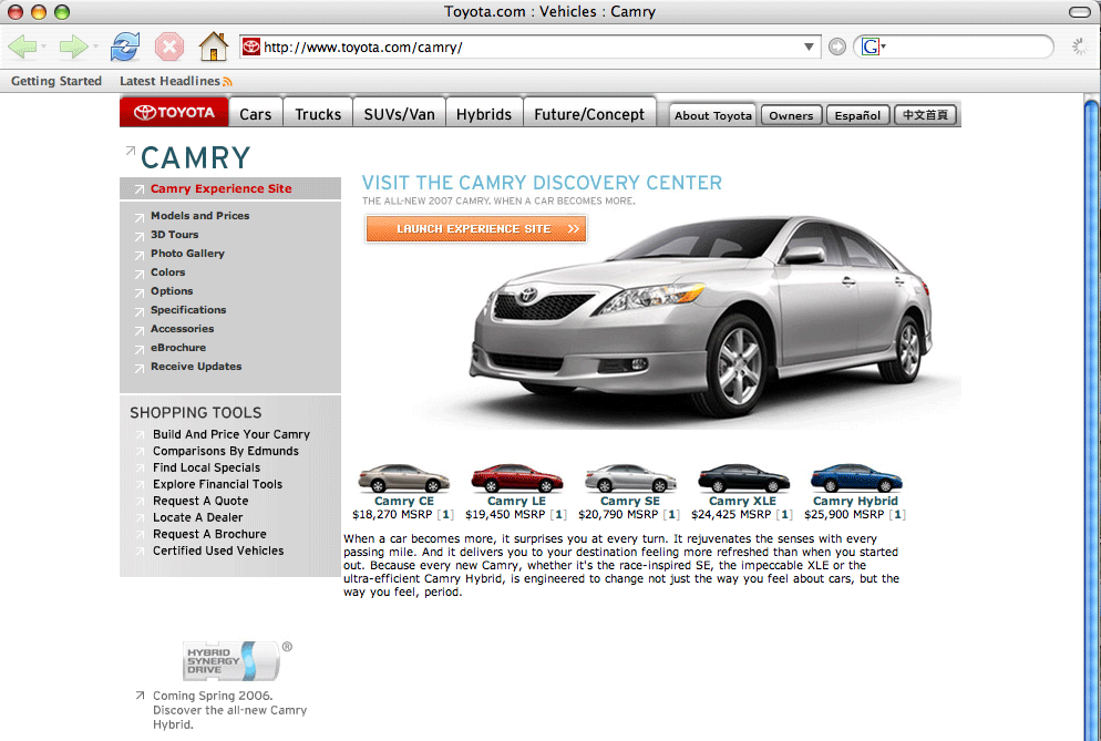A recent ad, the “All New 2007 Toyota Camry, was run on MSN. The tagline said, “When a car becomes more, and a box declaring “Build yours now at Toyota.com invited us to click through to a page titled “Camry Discovery Center.