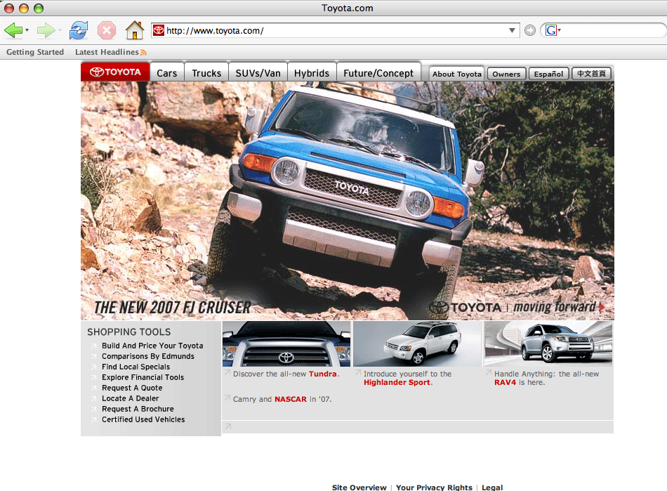 But when we surfed the internet for awhile and then visited Toyota.com by typing in the URL, we did not get the benefit of the branding reinforcement. Nowhere on the home page was a Camry, no mention was made of “When a car becomes more, and, while there was a button to “Build and price your Toyota, nothing calls it out from the rest of the page.