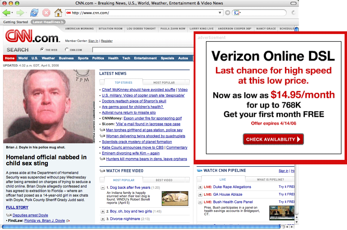 Verizon ran an ad on CNN for Verizon Online DSL, which proclaimed, “Last chance for high speed at this low price. Now as low as $14.95/month for up to 768K. Get your first month FREE.
