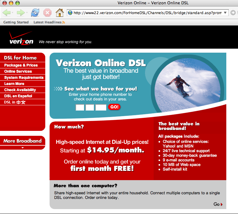 The landing page stated clearly, “Verizon Online DSL, and included the same offer: “High speed internet at dial-up prices, starting at $14.95/month. Order online today and get your first month FREE.