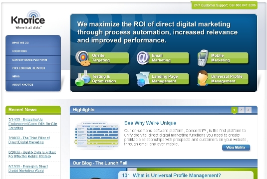 Knotice's direct digital marketing software solutions include Mobile Marketing, Email Marketing, Onsite Targeting, Testing & Optimization, Landing Page Management, and Universal Profile Management.