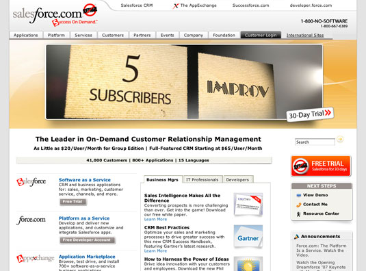 Salesforce.com is the market and technology leader in on-demand business services. The company's Salesforce suite of on-demand CRM applications allows customers to manage and share all of their sales, support, marketing and partner information on-demand. The Salesforce Platform, the world's first on-demand platform, enables customers, developers and partners to build powerful new on-demand applications that extend beyond CRM to deliver the benefits of multi-tenancy and The Business Web across the enterprise. The Salesforce Platform allows applications to be easily shared, exchanged and installed with a few simple clicks via salesforce.com's AppExchange directory, available at http://www.salesforce.com/appexchange. Customers can also take advantage of Successforce, salesforce.com's world-class training, support, consulting and best practices offerings.