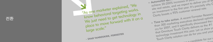 Omniture는 이러한 목적을 달성하기 위해 최상의 아이디어를 신속하게 테스트하고 지능적으로 고객을 타케팅함으로써 최고의 온라인 경험을 제공하는 제품들을 보유하고 있습니다.