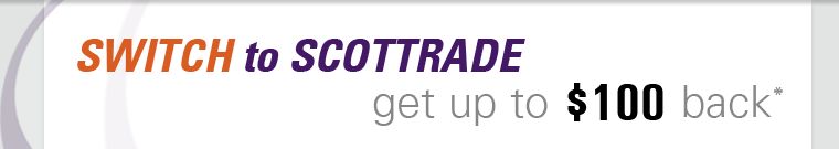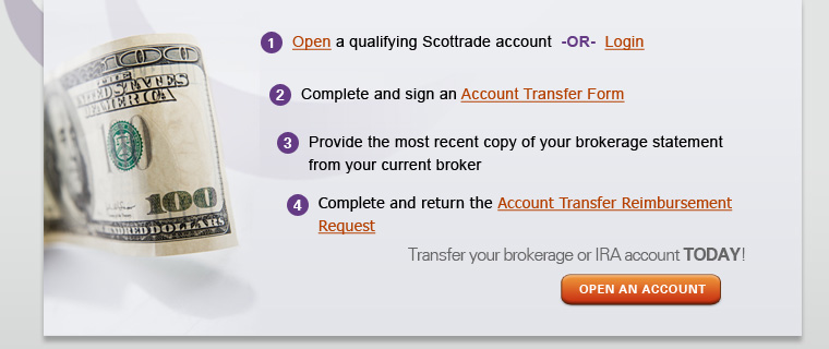 ©2009 Scottrade. Brokerage Products and Services offered by Scottrade, Inc. – Member FINRA and SIPC. *Terms and Conditions Scottrade will reimburse the account transfer fees up to $100 charged by another broker when you transfer your account with a value of $25,000 or more to Scottrade. You must apply for the fee reimbursement offer by completing and submitting a Scottrade Account Transfer Reimbursement Request form and a statement providing proof of imposed transfer fees. Account Transfer Reimbursement Request forms and proof of transfer fees can be mailed, faxed or personally delivered to your local Scottrade branch office. Reimbursement will be made to your account via a credit within 30 days of receipt of the Account Transfer Reimbursement Request form and proof of transfer fees. Online market and limit equity orders are just $7 for stocks priced $1 and above. Offer valid for transfers that occur between June 1, 2008 through December 31, 2009. Scottrade reserves the right to terminate this offer at any time without prior notice or extend the offer at its sole discretion. Void where prohibited. |